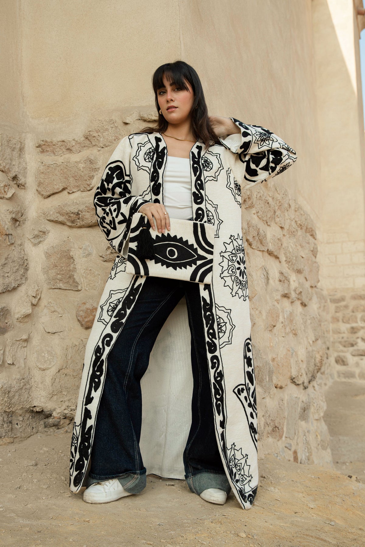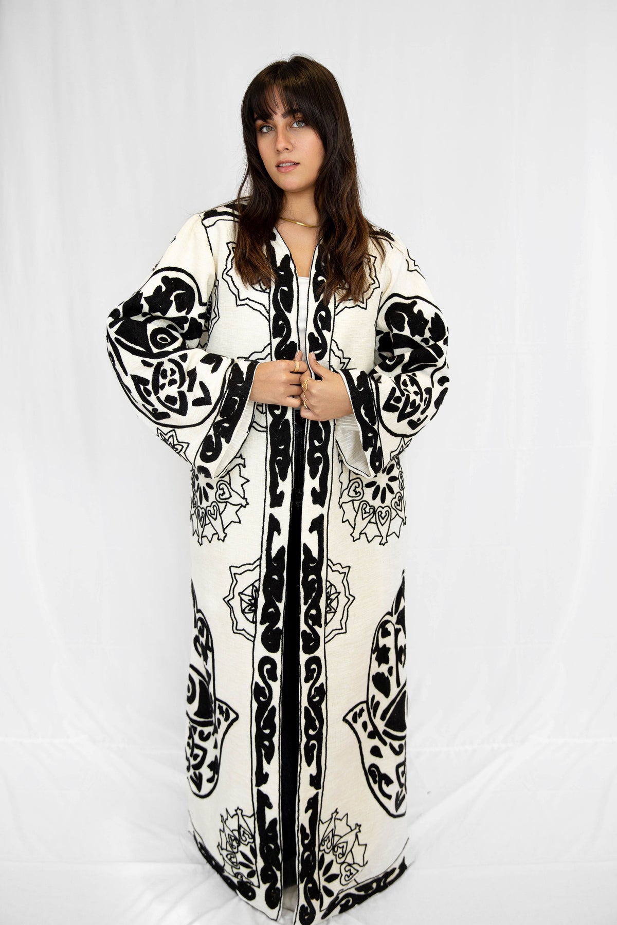 Egyptian Handmade Embroidered Kimono - KAF Design in Black (LONG)