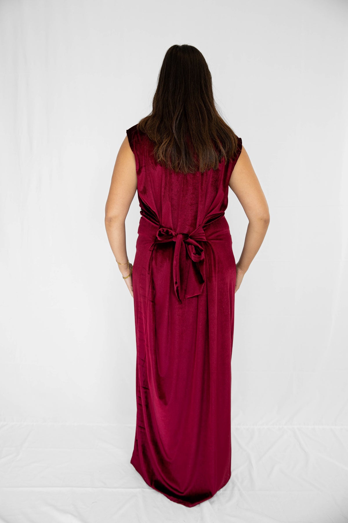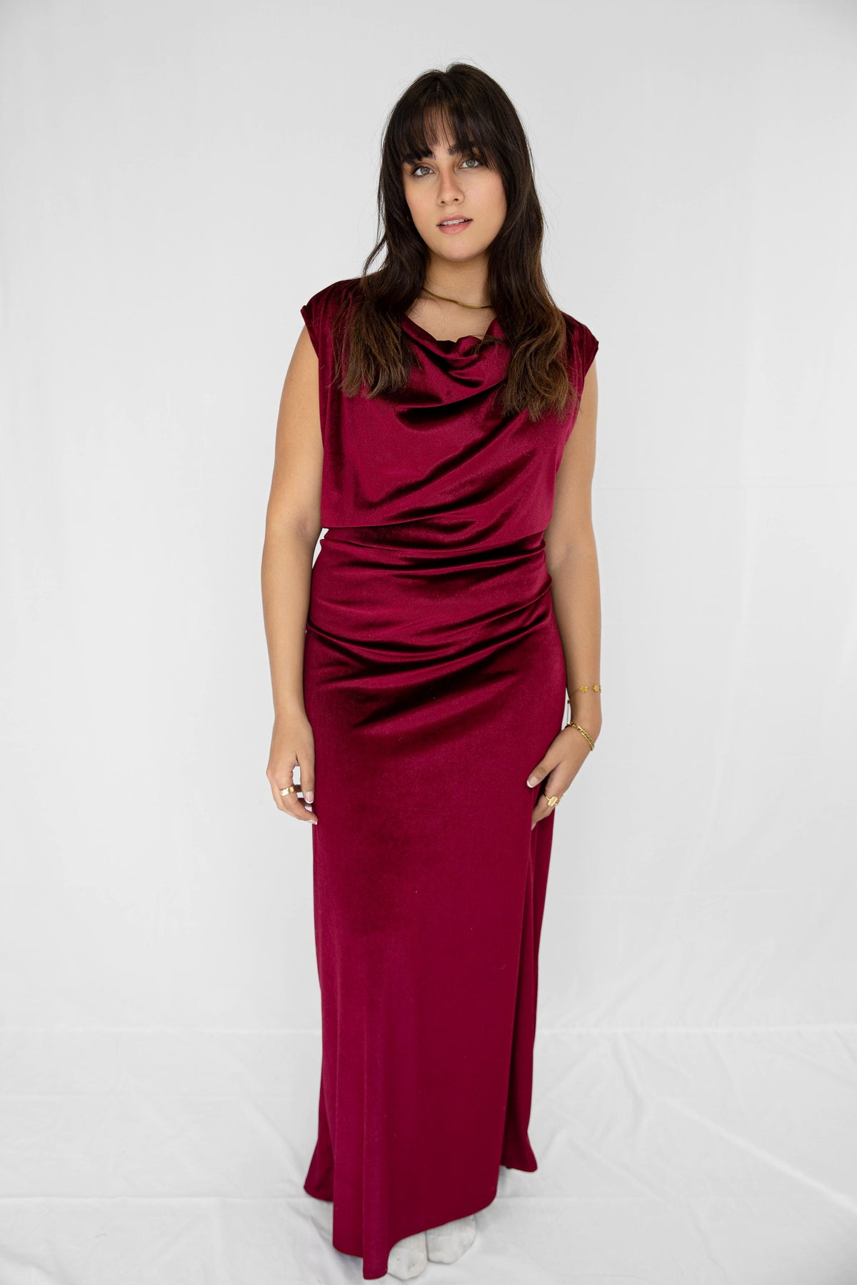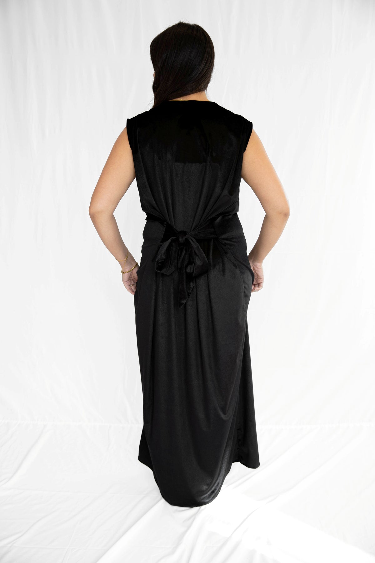 A versatile essential designed to be worn effortlessly under kaftans, while also standing beautifully on its own as a sleek and elegant dress with draped detail at the front that enhances the silhouette and adds a refined, flattering flow.