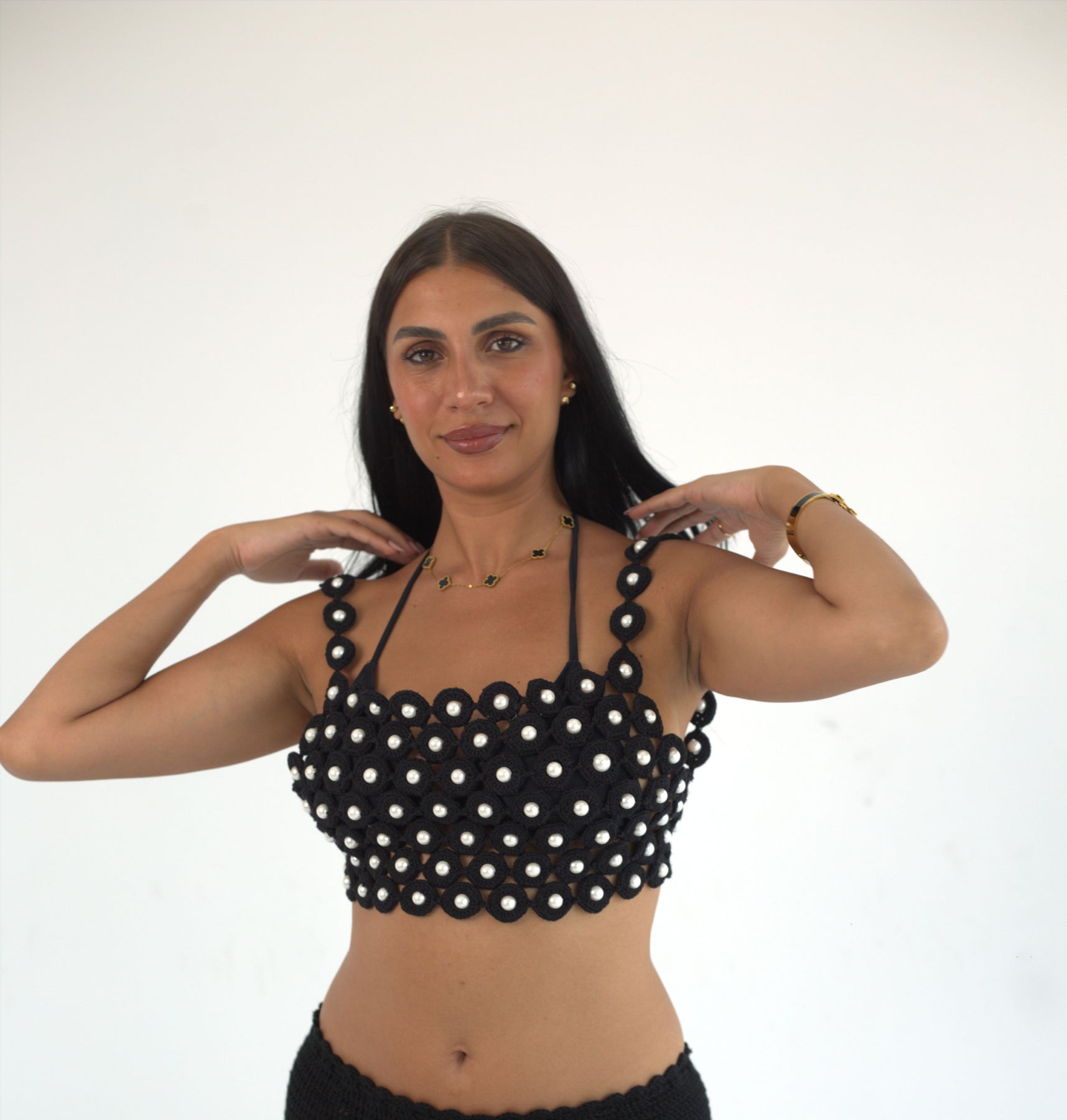"Pearly Pearl Backless Top" in black
