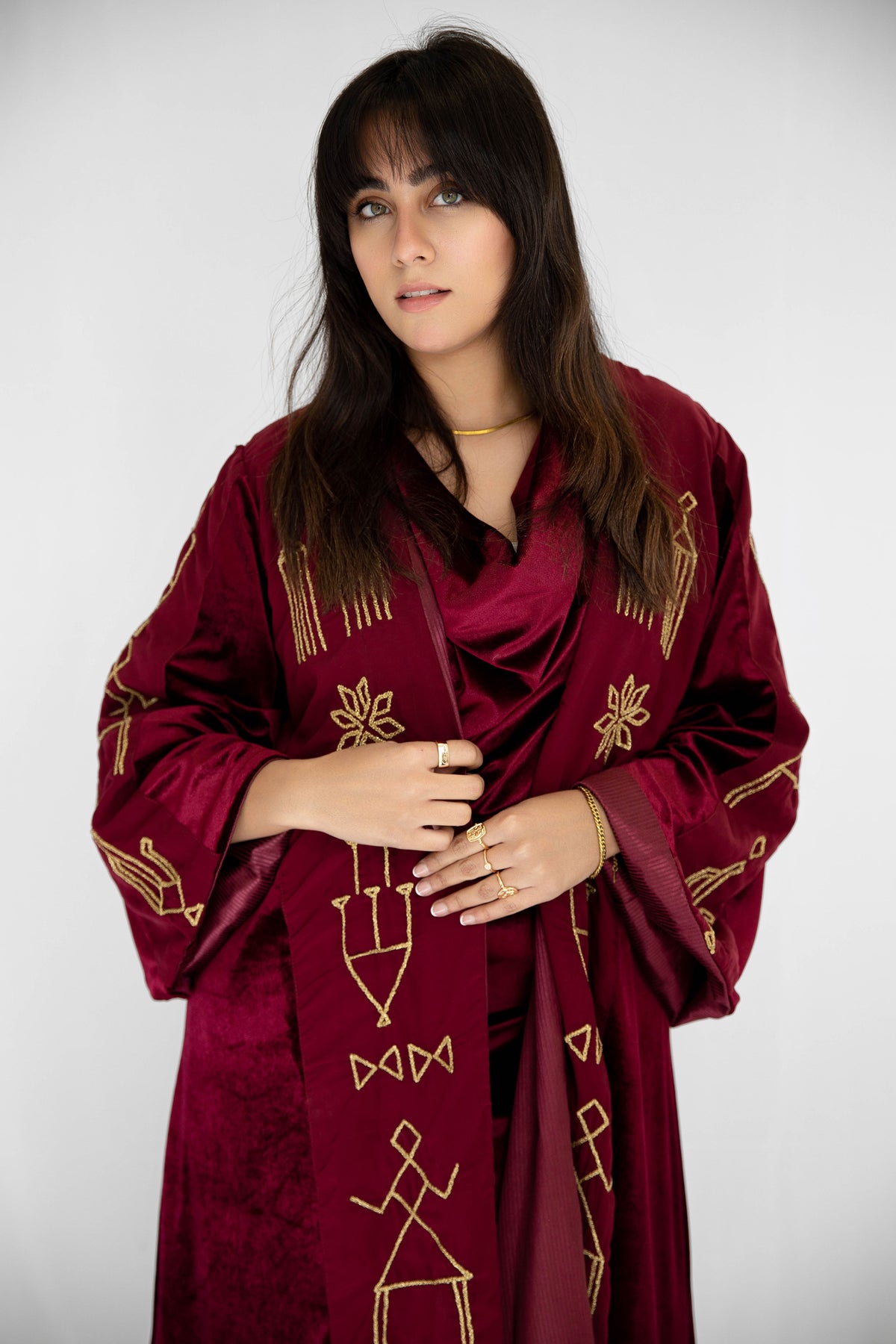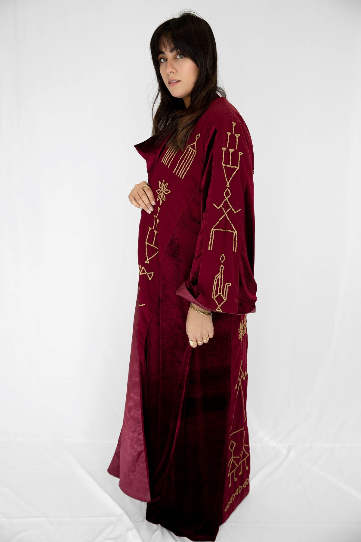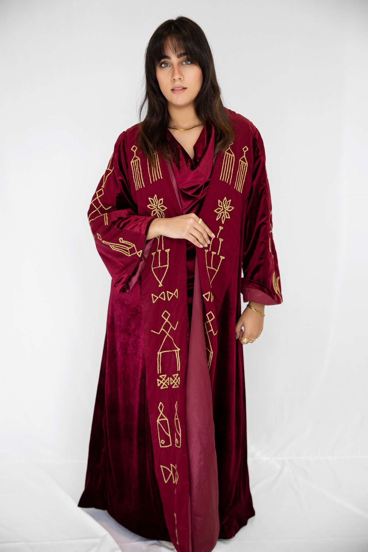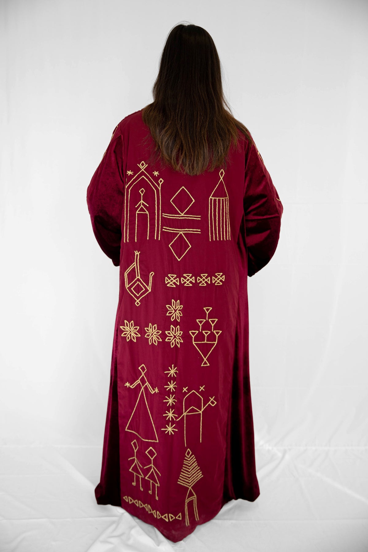 Inspired by wedding-day tally marks from Sohag, Upper Egypt, this kaftan tells the story of a bride surrounded by her friends as she steps into a new life. The symbols reflect rituals of celebration, protection, fertility, and home—marks once used to record unions, blessings, and shared joy.