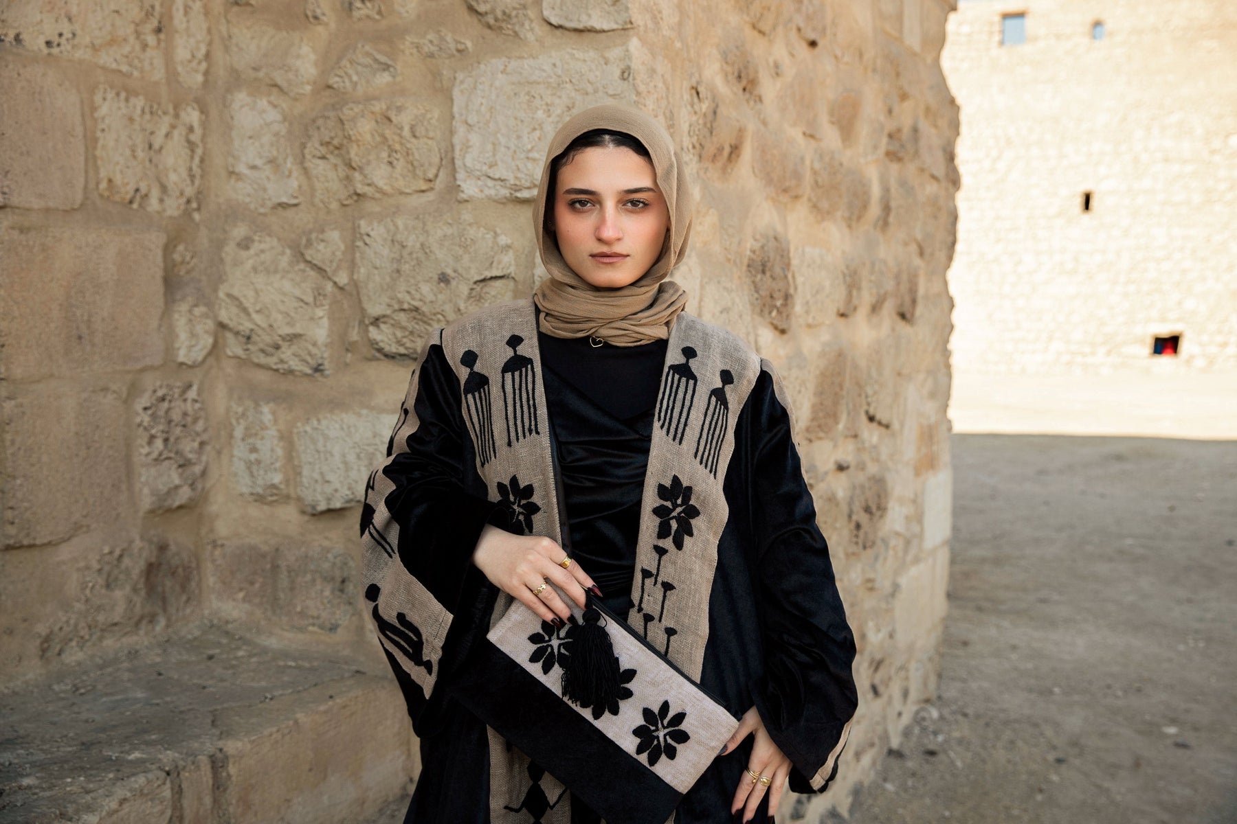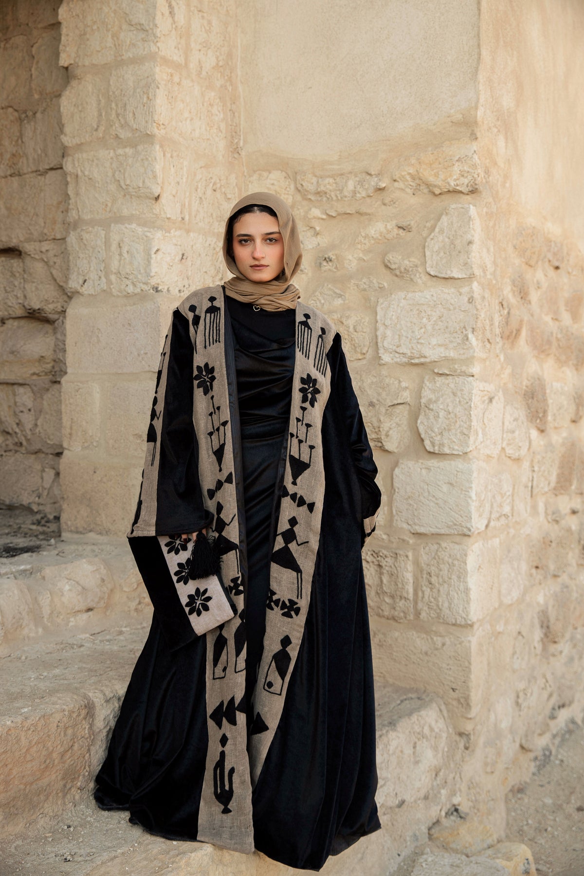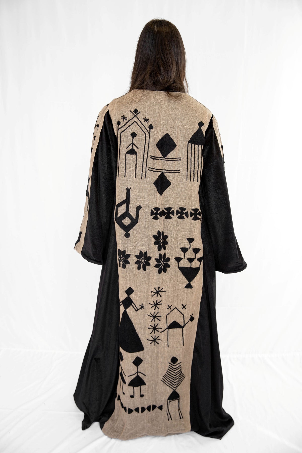 Inspired by wedding-day tally marks from Sohag, Upper Egypt, this kaftan tells the story of a bride surrounded by her friends as she steps into a new life. The symbols reflect rituals of celebration, protection, fertility, and home—marks once used to record unions, blessings, and shared joy.