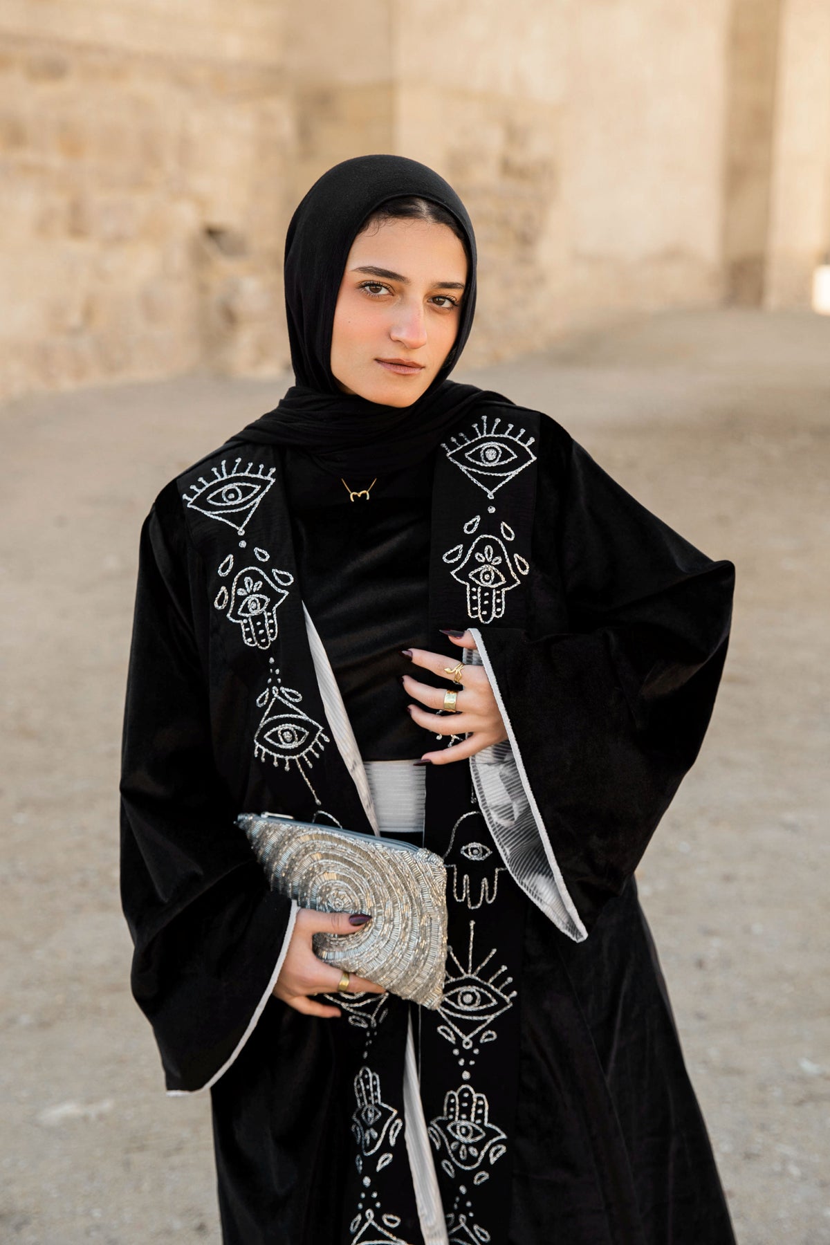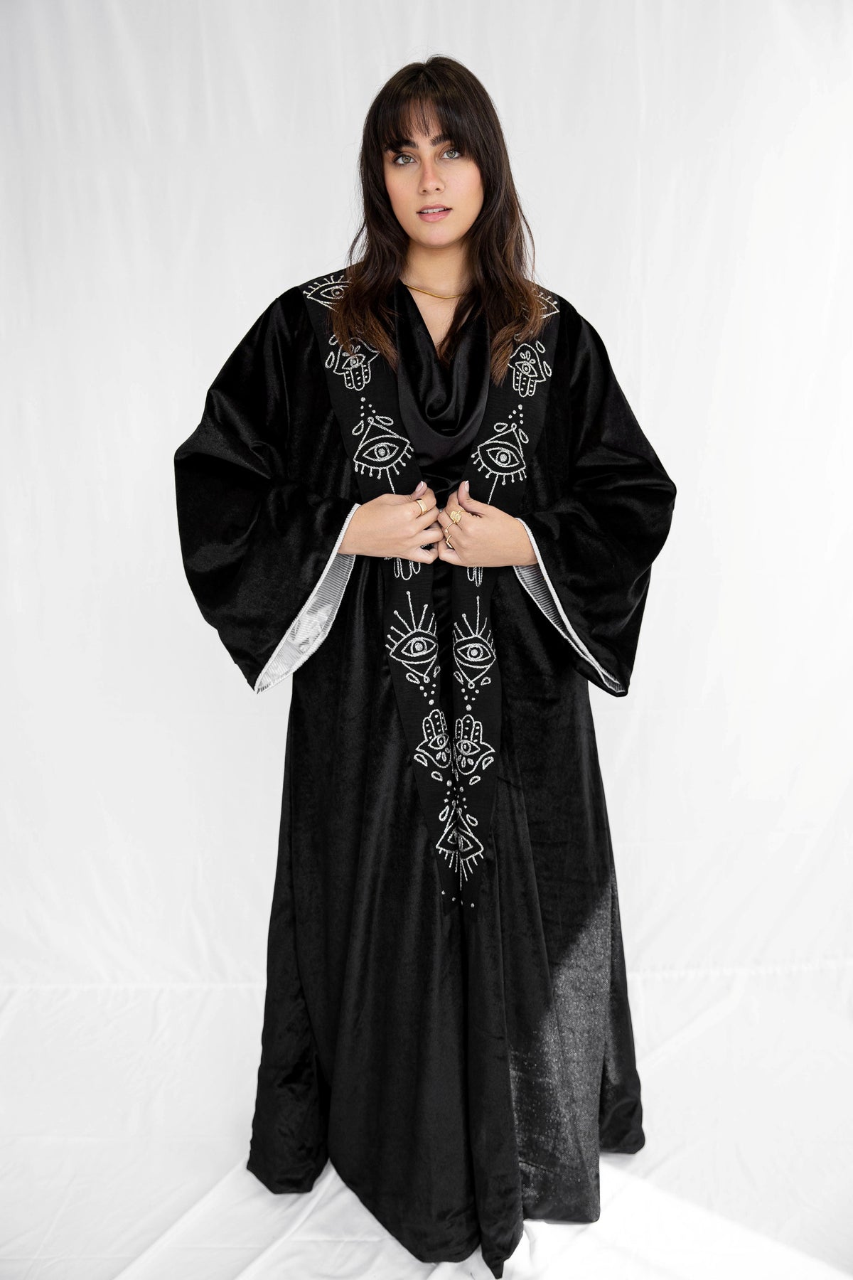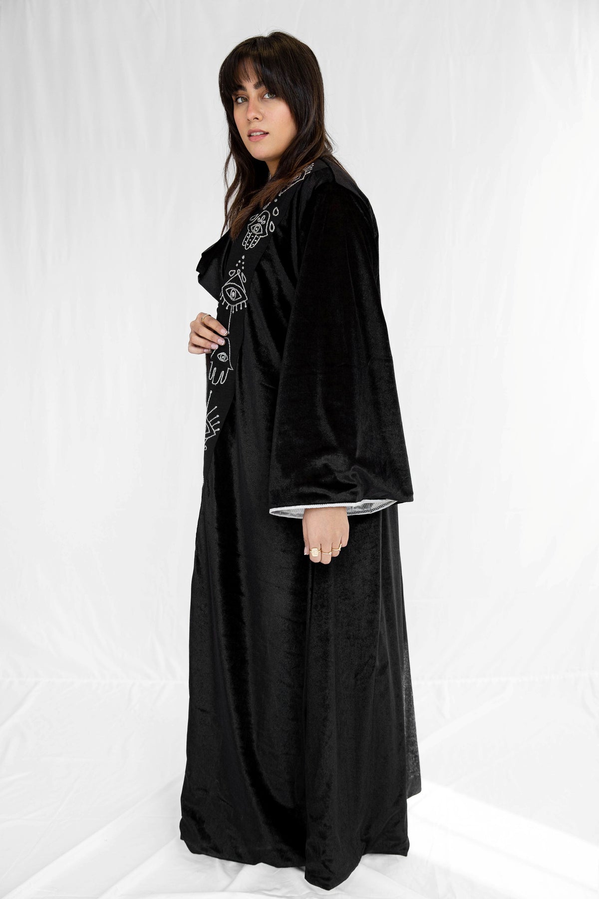 Unleash Your Inner Mystique with the Black Kaftan with Hand-Embroidered Eye & KAF in Silver