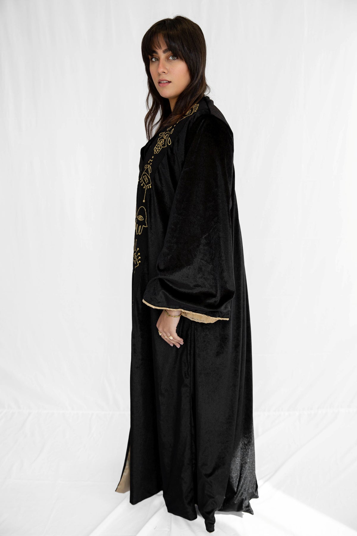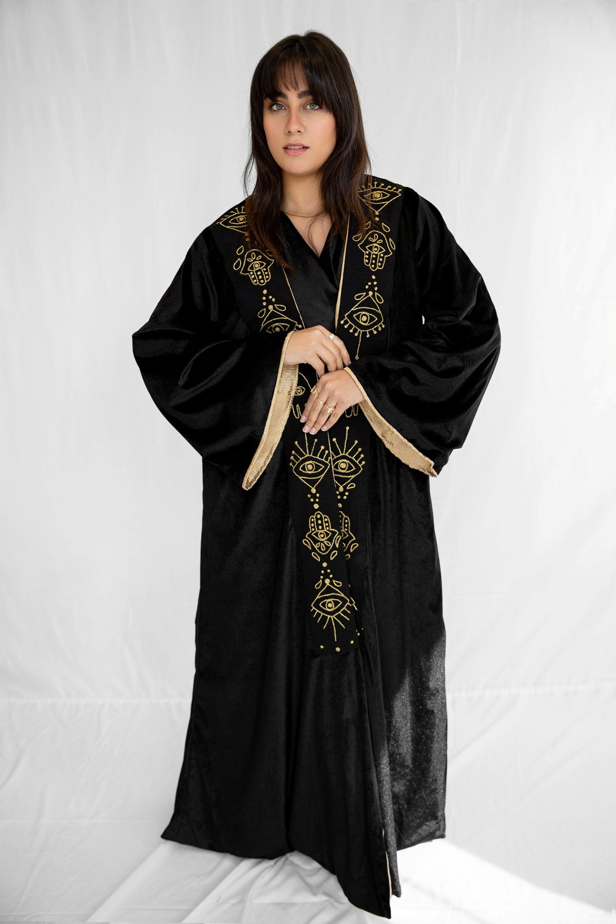 Unleash Your Inner Mystique with the Black Kaftan with Hand-Embroidered Eye & KAF in Gold