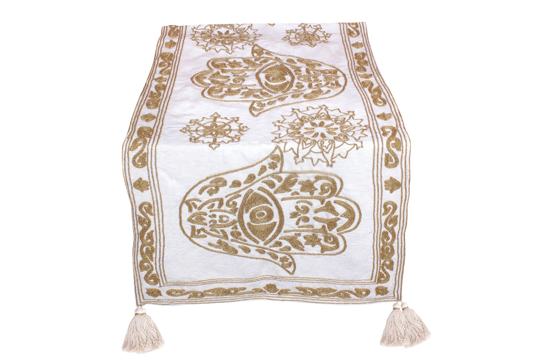 [{"id":46776498421929,"title":"Default Title","option1":"Default Title","option2":null,"option3":null,"sku":"140138","requires_shipping":true,"taxable":true,"featured_image":null,"available":true,"name":"Golden Hamsa Serenity Table Runner","public_title":null,"options":["Default Title"],"price":420000,"weight":0,"compare_at_price":null,"inventory_management":"shopify","barcode":"","requires_selling_plan":false,"selling_plan_allocations":[]}]